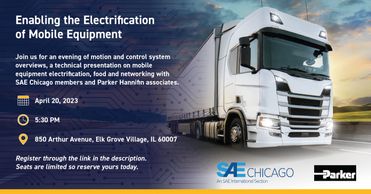 Parker hosted SAE Chicago for an evening of motion and control system overviews, a technical presentation on mobile equipment electrification, and food and networking with SAE Chicago members and Parker Hannifin associates.