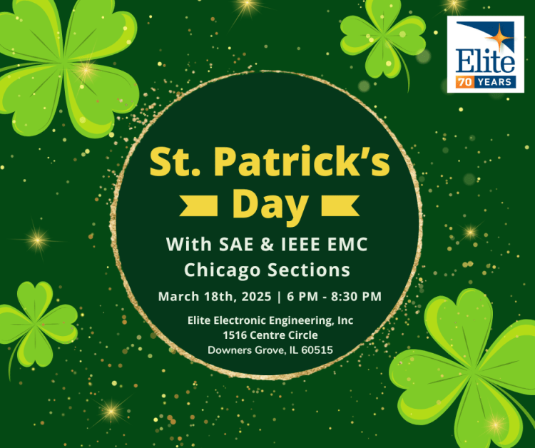 What: Elite Engineering will host SAE Chicago and IEEE EMC Chicago Sections for a St. Patrick’s Day networking event and a technical talk. Members, guests, and interested attendees came together for a festive evening of conversation and professional networking.